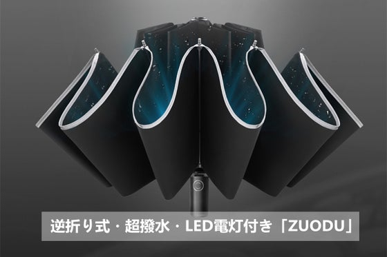 ▲便利さを特徴とする自動式の折り畳み傘は、逆折りに進化して、濡れた傘のわずらわしさを解消さます。▲反射材付きの傘は暗い夜道でもドライバーからの視認性を高めて事故...