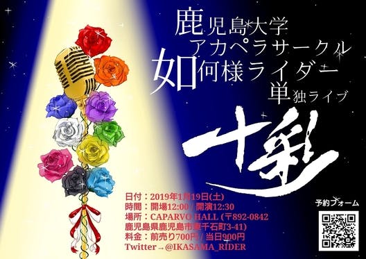 鹿児島大学アカペラサークル如何様ライダーが開催する、第5回単独ライブ!今年のテーマは「十彩(といろ)」。「色」を全面に押し出した、如何様が誇る個性豊かな10バン...
