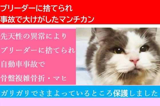 怪我をした迷い猫を保護しました。治療費等が個人で抱えきれないため、支援を募らせてください。 保護したときガリガリ、自動車事故で骨盤粉砕骨折、後ろ右足マヒ、骨盤骨...