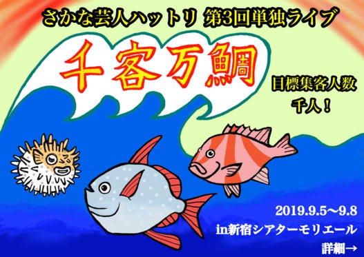 魚をテーマにしたネタを披露する水産系芸人、さかな芸人ハットリの第3回単独ライブ。このライブを開催するにあたり、CAMPFIREにてチケットを限定枚数、先行販売い...