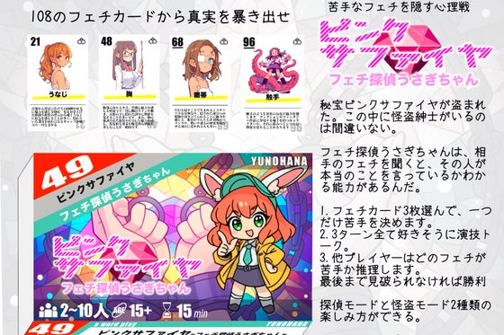 探偵パートではフェチを好きそうに語って、苦手を隠す心理トークバトル! ・フェチカード3枚を選んで、1つだけ「苦手」を決める ・3ターンで好きそうに演技トーク! ...