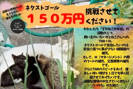 私たち「すみねこ大牟田」は猫たちのくらしを守るため愛護活動を行っています。そこへ昨年起きた「多頭飼育崩壊」行き場をなくした猫たち34頭を緊急保護。しかし、経年劣...