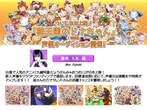 台湾で人気のアニメ「九藏喵窩(じょうざんみゃおうお)」が日本上陸!アニメ&番組に出演する声優をクラウドファンディングで選抜します。皆さんの手で、応援するタレント...