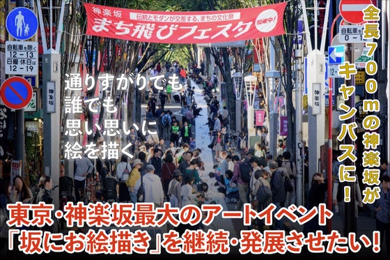 1999年から続いている「神楽坂まち飛びフェスタ」の最大の目玉は、全長約700mの神楽坂に白いロール紙を敷いて、通りすがりでも誰でも思い思いに絵を描く「坂にお絵...