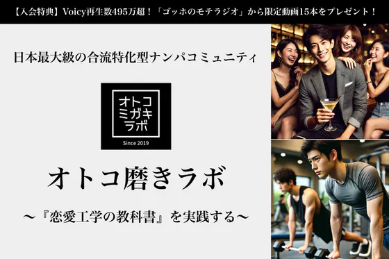 ワンランク上の女性に選ばれる「モテる男」を目指す同士が集う、日本最大級の合流特化型ナンパコミュニティ。『恋愛工学の教科書』著者ゴッホが設立し、現在はナンパ歴10...