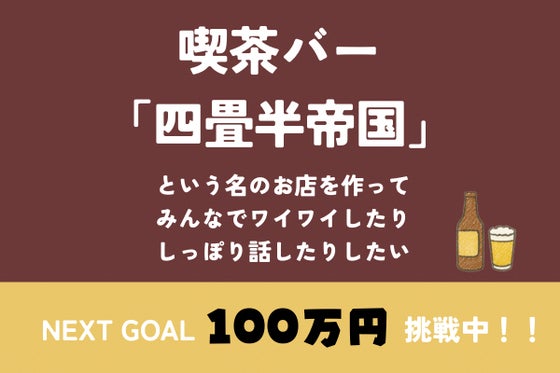 【NEXT GOAL 100万円挑戦中】みんなでワイワイしたり、誰かとしっぽり話したり、ふらっとふわっと楽しい場所。 隠れ家喫茶バー「四畳半帝国」を作りたい!