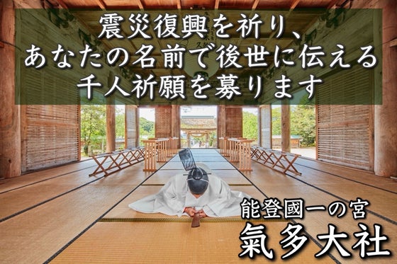 能登一宮気多大社は、能登半島地震に際して、復興の支えとなり、後世に伝えたい。祈りには力があり、この千人祈願は、皆様の祈りが神様に届き、大きな力となって、日々の生...