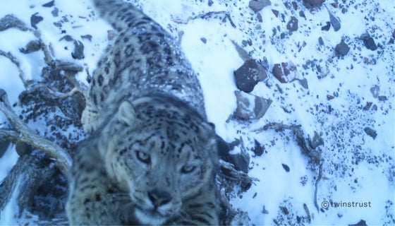 密猟や温暖化による生息地の減少で個体数が減ってしまい、絶滅危惧種に指定された「ユキヒョウ」を守るために、生息地調査を行うプロジェクト。モンゴルの山岳地帯に赤外線カメラを設置し、ユキヒョウの撮影に成功しました。