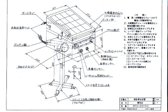 カラス、ハクビシン、イノシシ等の害獣撃退装置レーザービーム仕様(PSCマーク表示済)を設計し、試作機を製作して使っていただいたところ、大変効果がありましたので量...