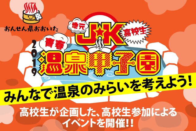 J★K(地元高校生)温泉甲子園は、温泉が大好きな一人の女子高生 寺田梨和が、その思いを伝えるため別府市が開催した「ONE BEPPU DREAM AWARD 2019」に応募しグランプリを勝ち取ったことから始まりました。いつの日か国民の休日として「湯の日」を作りたい…その壮大な目標のプロローグとして、おんせん県である大分の高校生が温泉に入るきっかけを作り、温泉の持つ様々な魅力を知ってもらい、楽しみながら、親睦を図ることを目的として開催いたします。
