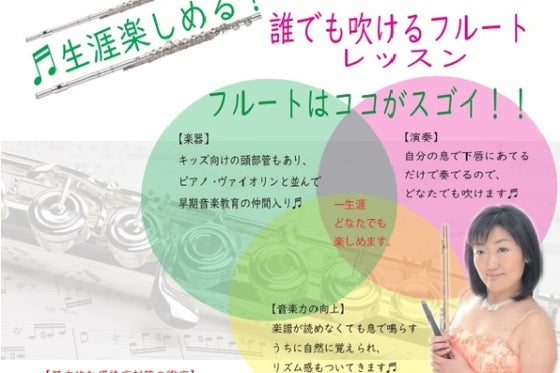 幼少期からピアノとソルフェージュを学び音高、音大、専攻科、研究所で研鑽を積み、13年大手音楽教室でフルート講師を勤めてきました。2人目出産後、夫の勤務の関係から大手音楽教室を休職せざるを得なくなり、フリーとなり、かつしか音楽家協会という名で活動を展開しようと立ち上げました。何かと多いフルート奏者なので私ならではの何かをと思い、音大時代の恩師からの教えをもとに、フルートの呼吸法を徹底的に追究して生活のための身体作りと、ピアノの奏法のコツにも結びつくテクニックを習得しました。