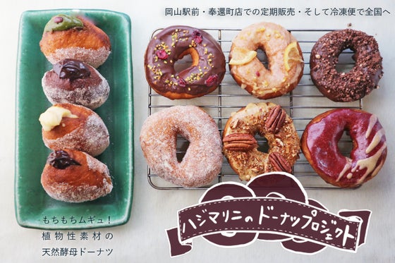 植物性素材の焼き菓子店が作るもちもち系天然酵母ドーナツ!岡山奉還町2号店での定期販売&遠方には冷凍して全国発送するハジマリニのドーナツプロジェクトです。リターン...