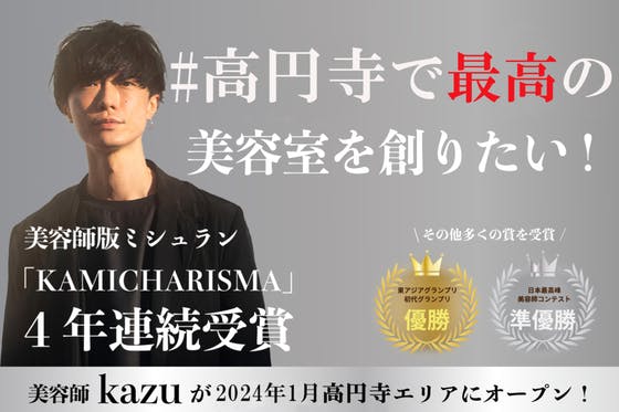 政府公認美容師ミシュラン「KAMICHARISMA」を4年連続受賞する人気美容師 kazu が2023年12月 高円寺エリアに美容室をオープン。「生涯通いたい美...