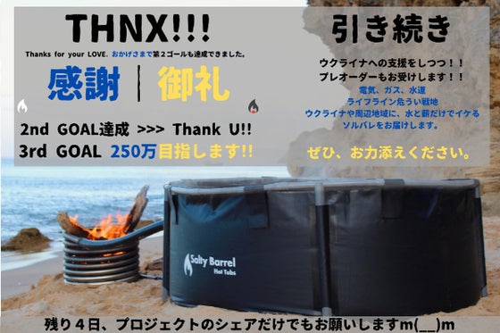 先行発売と上陸支援を兼ねた目標は、おかげさまで達成できましたので、残り10日間は新たに『持ち運べるお風呂をウクライナへ』に挑戦します!!飲み水にならない水、薪じ...
