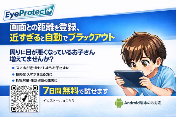 自分も目が悪いですが、小さいこたちがタブレットを近くでみて、目を悪くしてしまうことを防ぎたいです。 現在EyeProtect+というアプリで顔が近いと暗くするア...