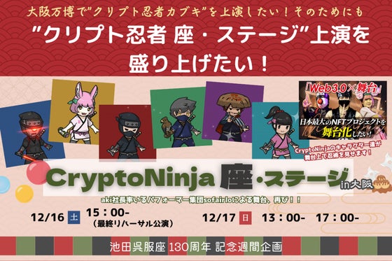 大阪 池田呉服座130周年の”デジタルと伝統芸能を融合する”企画として、日本発のNFT”CryptoNinja(クリプト忍者)”を、aki社長率いるパフォーマ集...
