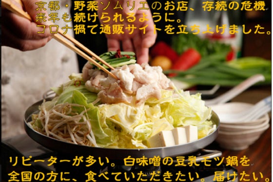 京都鴨川近くで野菜・ソムリエのお店を運営しております。当店は地元の美味しい野菜と白味噌の豆乳モツ鍋が食べられる創作料理店です。コロナで大打撃を受け存続の危機に立...