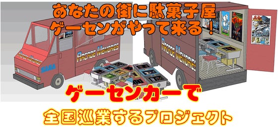 80年代アーケードゲームと駄菓子屋ゲーセンへの強い思い入れから、 あの頃の記憶を記録しておきたいとの気持ちが年々高まってきて、 昭和の香りの残るゲーセンを訪問して, ブログに記録するなどの活動をしていましたが、 ゲーセンカーで全国巡業をして各地で駄菓子屋ゲーセンを再現するという プロジェクトを,クラウドファンディングの力を借りて行う事にしました。