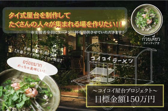 本格的な屋台を作ってタイ料理(ラーメンなど)を提供します!!京都の鹿ヶ谷(銀閣寺エリア)で地域の活性化や人々の交流のある場所を作りたいと考えており、いずれは他の...
