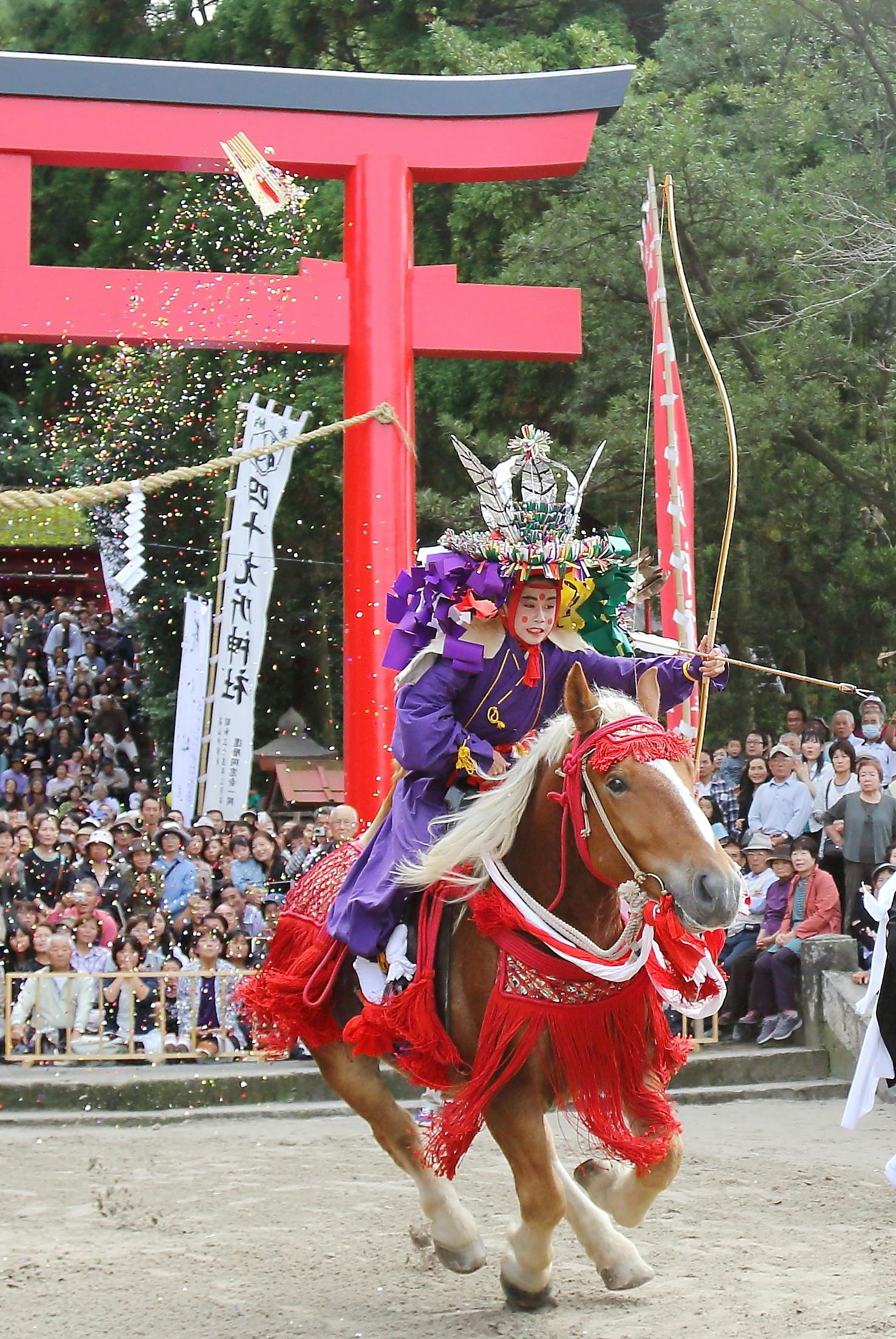 鹿児島県の無形民俗文化財にも指定されている高山流鏑馬。町内の中学二年生男子から射手が選ばれ神事を行います。本来、馬が2頭必要ですが財政が厳しく1頭しかおらず、馬...