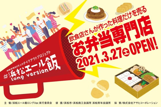 市内の飲食店25-30店舗のお弁当・お惣菜を集め、毎日販売。浜松の中心街のど真ん中(松菱跡地)に仮設テント(36畳分)を設置し、テントですが壁あり、床あり、冷蔵...