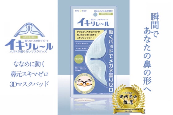 鼻元スキマを追従する発明「イキソレ〜ル3Dパッド」は斜めに動いてマスクのスキマを90%カット。外でもメガネが曇らない。ウイルスや花粉の直接侵入を軽減し予防アップ