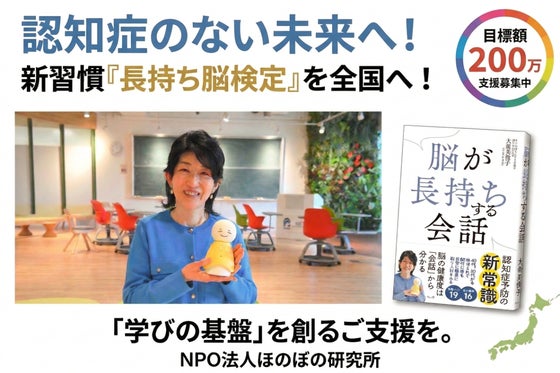共想法で実績あるほのぼの研究所が知見を結集し、社会を変えるために放つ「長持ち脳検定」。一生、脳が長持ちする生活習慣を広め、一人でも多くの人が行動することで、脳が...