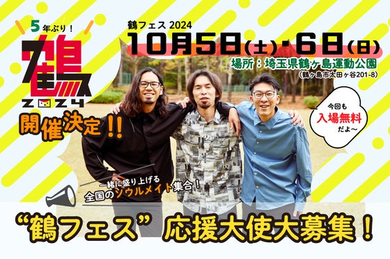 鶴のふるさとである埼玉県鶴ヶ島市にて、2回目となる無料野外ロックフェスティバル「鶴フェス」を開催!今回も鶴ヶ島市全面協力の下、10月5日(土)と6日(日)の2日...
