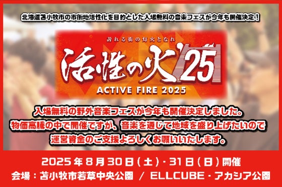 入場無料野外音楽フェス「活性の火'25」開催資金ご支援をお願い致します苫小牧駅前を活性化させたい、活性の火を通じて多くの笑顔を生み出したいとの思いから今年も開催...