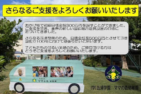 おかげさまで初期目標金額300万円を超すことができました。さらなる環境整備のため目標金額を500万円にさせて頂き、園創立100年に向けて頑張りたいと思います。