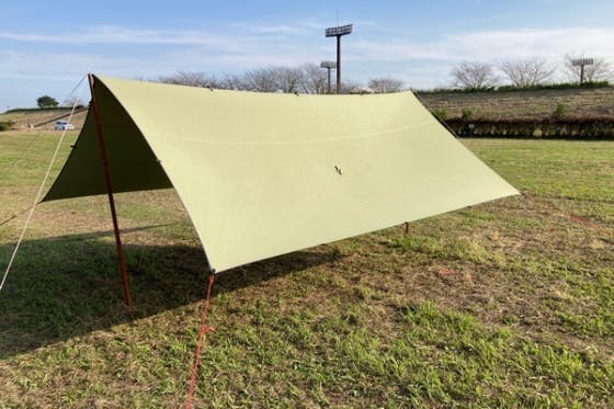 コットン100%のタープ、サイズは使い易い4m×4m、タープの外周とセンター部分にある21個のループがさまざまな張り方を可能にするタープ