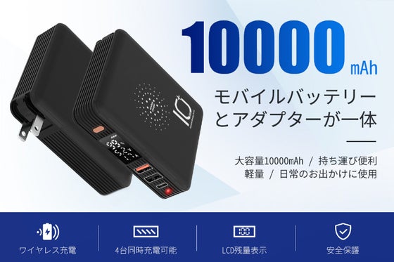 ACアダプタがー体型となったモバイルバッテリー!最大の魅力はワイヤレス充電が可能になったこと。大容量10000mAhで4つのデバイス(数台の携帯電話、パソコンな...