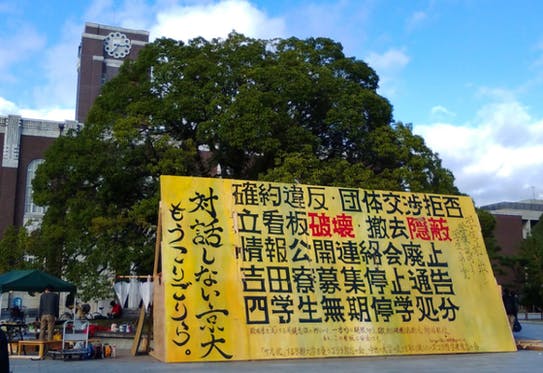京都大学では、学生個人やサークル・諸団体が自分たちの意見を看板に綴って大学構内に立てるという伝統が代々受け継がれ、一つの文化として今に残っています。この立看板文...