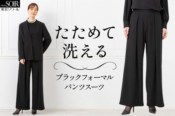 「たためて洗えるブラックフォーマル」第3弾はドレスのようなパンツスーツ!体のラインを拾わない、落ち感のある生地でお尻、太もも、足元を隠してスッキリ映えるパンツス...