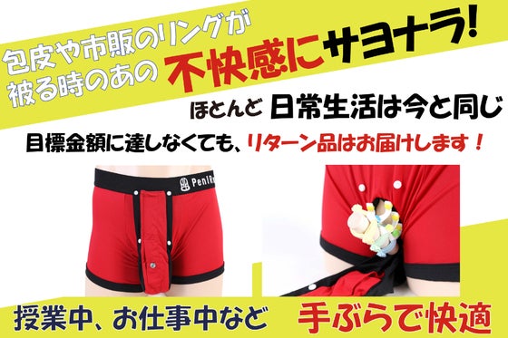 目標金額に達しなくても、リターン品はお届けします!自身の悩み、経験、試行錯誤の上に形になった、私の理想の下着、ペニレブ。包茎は、世界の男性の80%以上が抱える身...