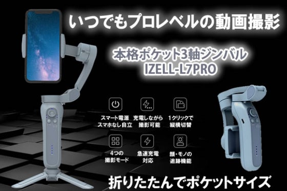 スマホでプロレベルの動画撮影を。最新!ポケット3軸ジンバル「IZELL-L7PRO」スマホなしで電源オン&自立! 手ブレなしで映画のようなワンシーンを。ズーム...