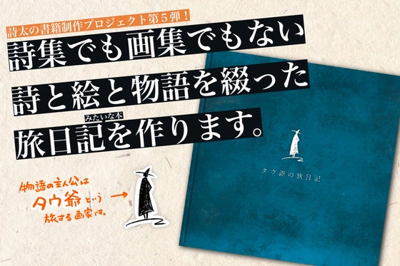 【詩人 詩太の書籍制作プロジェクト第5弾!】過去4作とは全く違う、詩集でも画集でもない、詩と絵と物語で綴った旅日記のような本を制作します。気軽に旅を楽しめなくな...