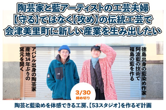 東北最古のやきものの産地、会津本郷焼に約14年ぶりとなる窯元を開きます。そして、徳島県で学んだ藍染めの技術で会津の藍染め文化を盛り上げます!私たちの新しい伝統工...