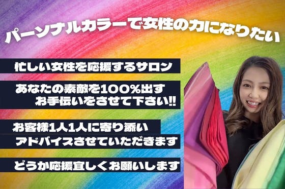女性が輝ける世の中を作りたい‼︎ 働く女性、子育てママ、専業主婦全ての女性が自分にあった場所で輝けるよう、力になりたい‼︎ これが私のビジョンです。 子供の出産を機に考え方が一変しました。 自分が経験したからこそ、同じ目線に立ち力になることができるはずです。 これまで会社員として6年間働かせていただいた会社を退職し、 パーソナルカラーサロンを開業することを決意しました‼︎ 自分に似合う色・スタイルを知ってもらい、 どんな時も自身が持てるよう "素敵自分" を知ってもらいたい。 悩んでいる女性の背中を押して、力になりたい。 そんな私の夢を叶えるためご協力お願い致します。