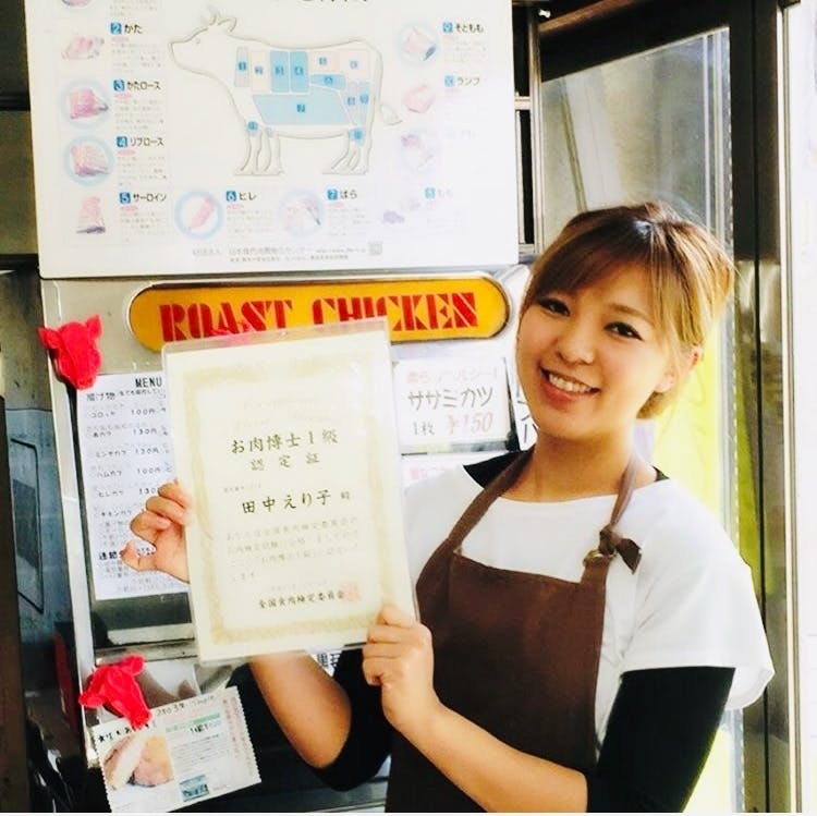 お肉博士一級「田中えり子」 昭和61年6月11日 田中家の長女として生まれる 幼少期~小学校 おてんばで勉強にスポーツに打ち込む活発な子供時代。 中学校~高校 吹奏楽部の部長を務めた中学時代から一転、自由を求めて高校を自主退学。通信制高校に編入し、働きながら無事卒業。 平成17年 19歳 大好きだったおばあちゃんが倒れ、家業に入る。 平成22年 大阪ビジネスカレッジ総合ビジネス学科「経営・営業・販売コース」入学 平成24年4月~平成25年6月 フィジー語学留学・オーストラリアワーキングホリデー(現地食肉工場「Thomas Borthwick&sons」勤務) 平成27年 29歳(にくどし!) お肉検定2級・1級W合格「お肉博士」になる 平成28年~現在 お肉ケーキのネット通販やデリカ部門「まんまみーあ!」の立ち上げ、イベント出店・コラボイベントなど、店外にも視野を広げ活動している。 ★趣味は旅と料理と食べ歩き。 ★特技は1秒で寝られること(ほぼ気絶) ★好きな肉料理は悩むけど…レアなステーキ!! ★好きな飲み物はビール ★資格マニアで現在10個の資格を持っている。 ☆番外編として日本空手初段で黒帯を持っている。 ☆ハマると一直線になってしまうオタクな気質も持っている。