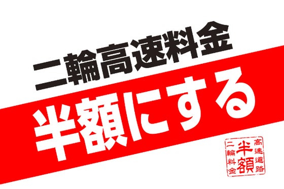 「二輪高速料金半額にする!!」 現在、ETC二輪車の高速料金は軽自動車と同じです。 その二輪の高速料金を半額にするため、みんなで国を動かしましょう。