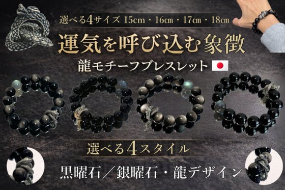 黒曜石または銀曜石をベースに、龍・ヘビモチーフを組み合わせたブレスレット。落ち着いた黒の質感と象徴的なモチーフが日常の装いに調和し、前向きな気持ちを後押しする一...