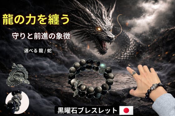 黒曜石または銀曜石をベースに、龍・ヘビモチーフを組み合わせたブレスレット。落ち着いた黒の質感と象徴的なモチーフが日常の装いに調和し、前向きな気持ちを後押しする一...