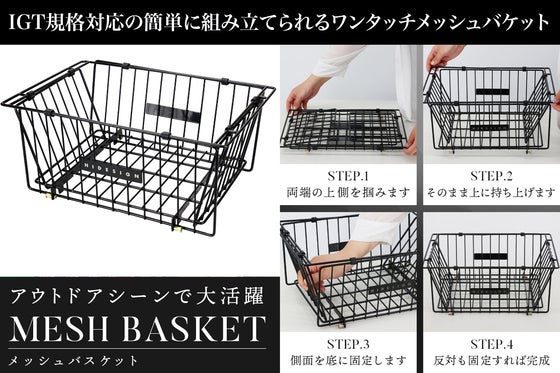キャンプやアウトドアで活躍するIGTテーブル規格の汎用型折り畳み式メッシュバケット スチール製で設置・撤収しやすいシンプルな折りたたみ式、数秒で展開するワンタッ...