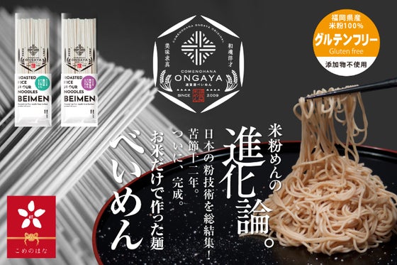 福岡県で生産された米『ふくのこ』だけで作った米粉乾麺『BEIMEN(べいめん)』。 もっと、日本のお米を美味しく、たくさん食べてほしいという思いで日本の稲作、製...