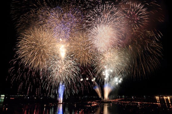 約400年の歴史を持つ燈籠流しと共に夏の夜空を彩る花火。約1万もの燈籠が宮津湾に流され始めると、打ち上げ花火が夜空にはじける。クライマックスには、海上スターマイ...