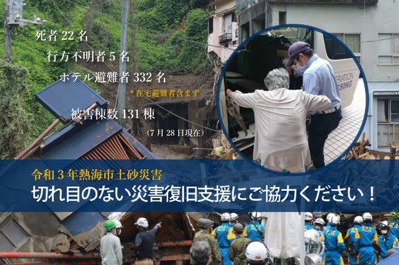7月3日の熱海市土砂災害発生後、緊急災害支援チームを派遣し、食料・水・衛生用品やその他必要物資をお届けしました。その後も無料バス送迎などの支援を継続、現在は住民...