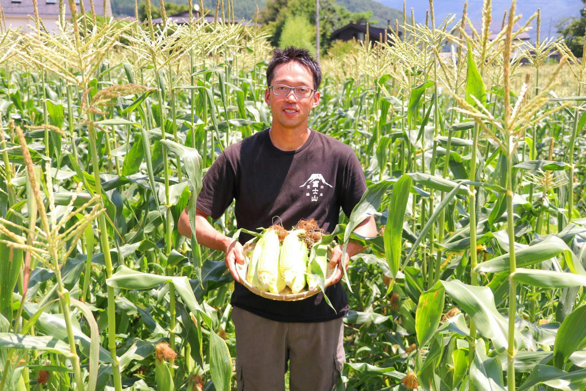 大澤武。 山梨県山梨市のサクランボ農家の三男。両親が農作業の大変な中でも楽しそうに働いている姿をみて小さい頃は将来は家の跡を継ぎさくらんぼ農園を大きくしていくことを夢見ていました。しかし大学生時に両親が共に倒れ、今後両親がいなく社会経験のない状態で家を継ぐことに覚悟ができず家業を長男にお願いしました。夢を諦め仕事につくことにしたが農家を夢見ていたことから食べ物に関わる仕事をしたいと思い総合食品卸加藤産業株式会社仙台支店に就職。メーカーが製造した商品を小売店に卸すという問屋の仕事に対し自分のやりがいは何なのか考えた時に、ずっと夢に想ってきた農業で自分で作物を育てその作物を自分で売りたい!!という思いが生まれ2010年山梨県の実家で就農。4年の研修を終え2014年富士河口湖町で「おおさわ園」として独立。河口湖では決して農業として成り立たないといわれていた桃の安定生産に初めて成功。また河口湖のとうもろこしの美味しさに「これはフルーツだ!!」と衝撃をうけ多くの人に食べてもらいたいと思い生産量を増やし個人とうもろこし生産量山梨県1位(当社調べ)2021年共進会スイートコーンの部で優秀賞・山梨県議会議長賞を受賞。現在河口湖で果物や野菜の摘み取り園を計画中。 河口湖にとうもろこしを食べに行こう! という文化を広げるために活動をしています!