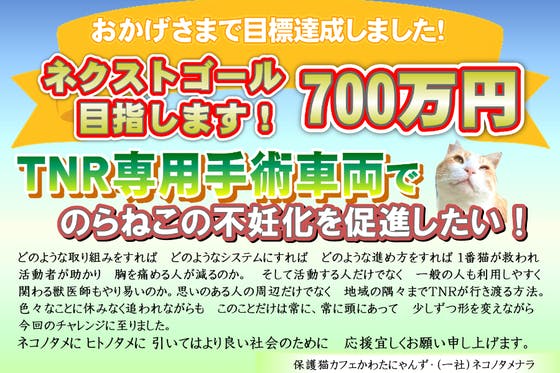 猫の殺処分を減らす根本的解決策は、のらねこの不妊化、TNRが最も有効です。しかし衛生的でないのらねこの手術は、感染症のリスクも大きいため、それに特化した場所があ...