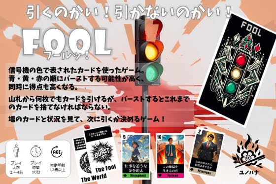 カードに書かれた信号機の色で、青・黄・赤色の順になるほどバーストする可能性が高いが、得られるポイントも高くなります。山札からは何枚でもカードを引くことができます...